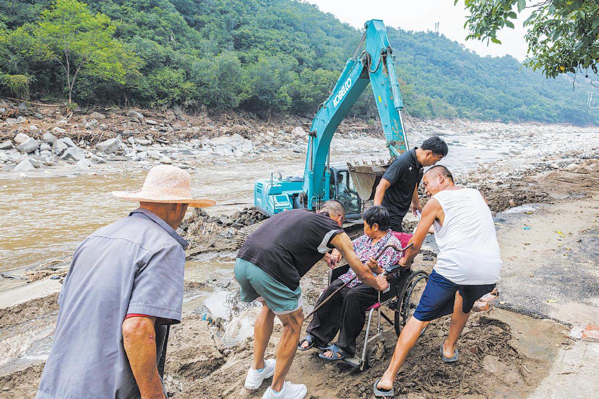 8月4日下午,密云区冯家峪镇,志愿者帮助行动不便的老人转移。 摄影/新京报记者 王子诚