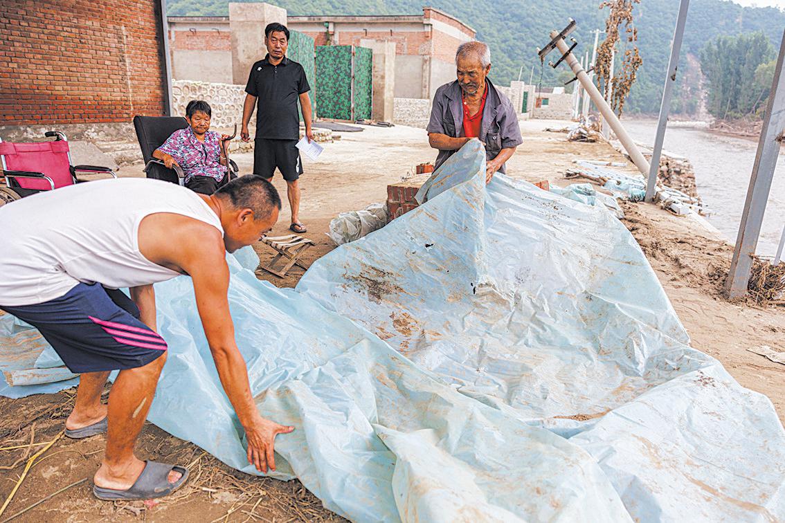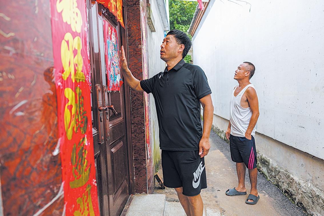 村民志愿者刘建国、刘小军、刘学军领完任务后,直奔村里的河东区域,这里有8户涉险户,小院全部临河道。“您甭看现在没雨,已经红警了,说下就下。您收拾收拾,如果一掉点儿,就往安置点走,到时候我们也会再过来。”提醒完一户村民,3位志愿者踩着泥泞的路,赶往下一户。