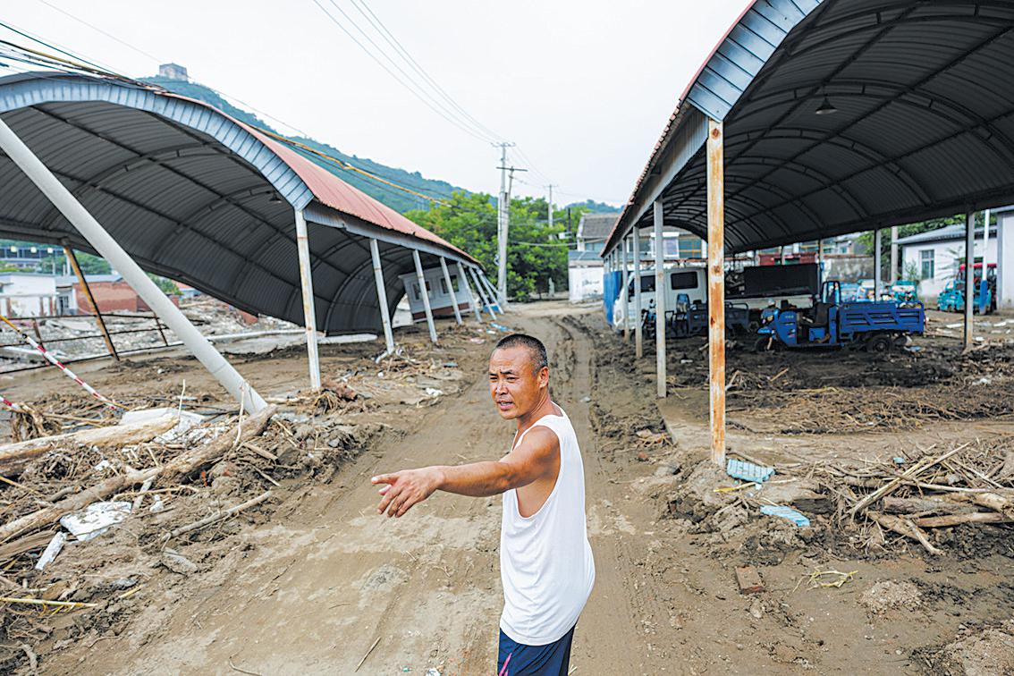 7月26日的暴雨过后,冯家峪村都是泥泞的道路,道路通行不畅,部分村舍损毁严重,断路、断水、断电、断通讯。经过连日抢修,8月4日中午,记者再次来到这里时,主干道可以保证车辆通行,工程车辆清除道路两旁的淤泥。中午时分,冯家峪村的天气闷热、潮湿,天空飘着几块厚厚的乌云,暴雨中水位暴涨的白马关河水位如今虽然下去不少,但是仍十分湍急。