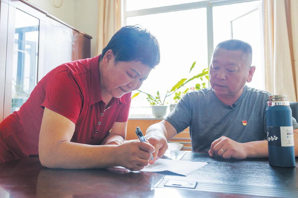 8月4日,密云区冯家峪镇,西庄子村妇联主席何淑英(左)与西庄子村党支部书记刘长宝正在商量防汛工作。 新京报记者 王子诚 摄