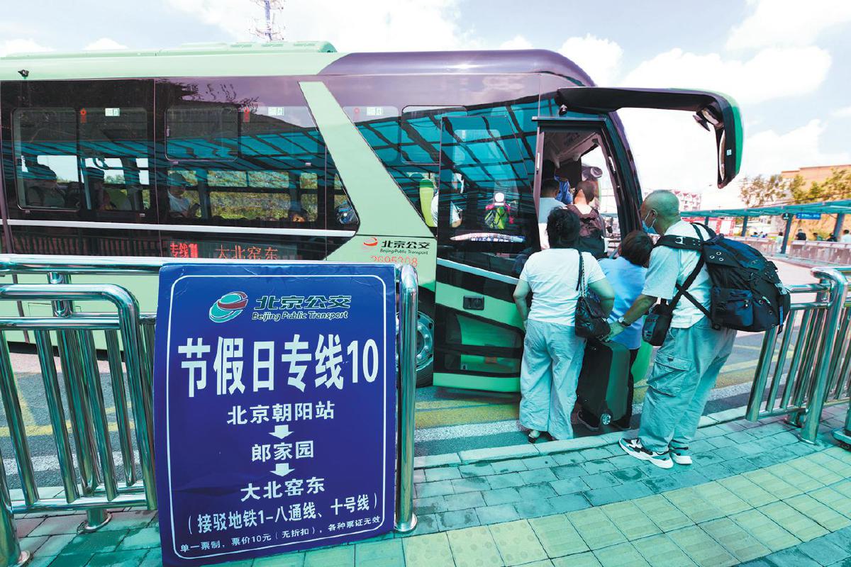 2024年8月18日,北京朝阳站的公交站台,一辆通学公交车承担接驳任务,乘客排队上车。 资料图片/新京报记者 王贵彬 摄