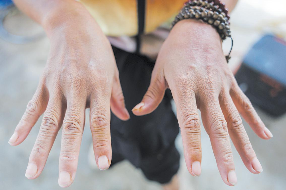 志愿者在“暖心灶台”长时间佩戴手套工作,手部已发白起皱。