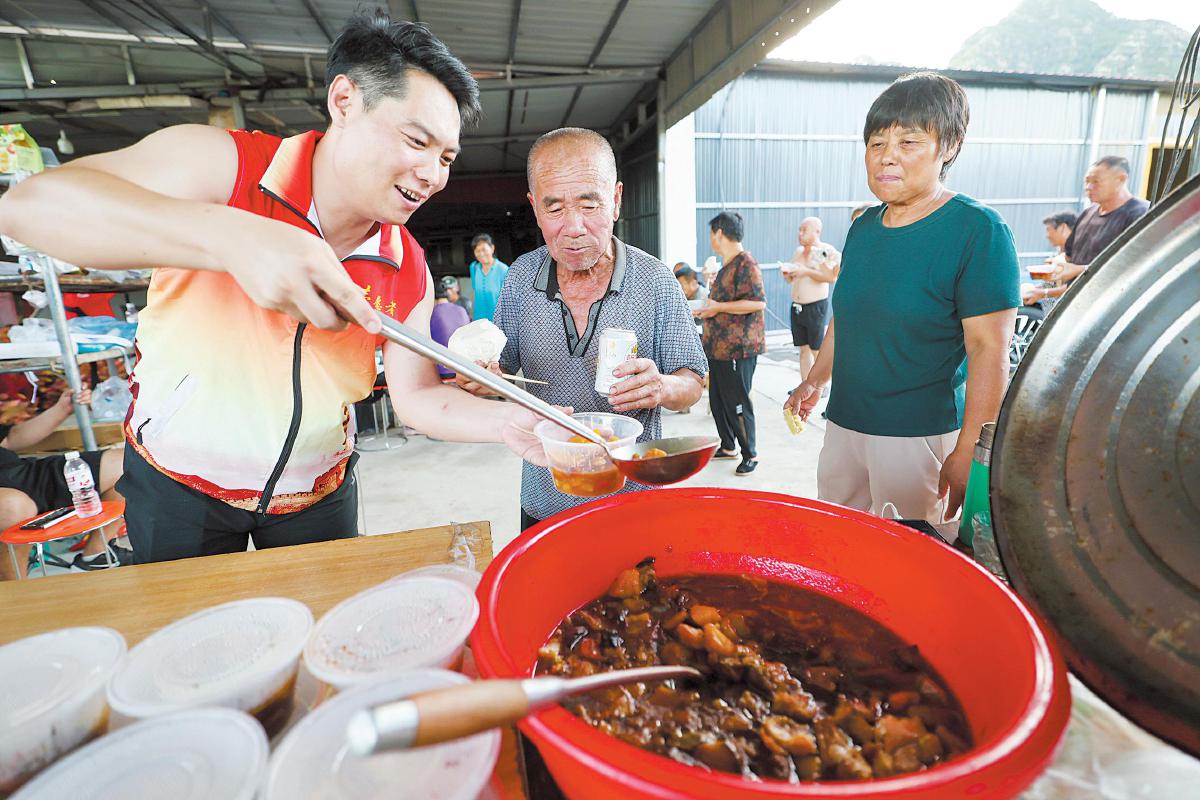 “大爷,您坐着,我给您把饭菜盛好端过去。”志愿者陈默热情地一边招呼着一位腿脚不便的村民,一边在手里的一次性餐盒里盛上了香喷喷的菜肴。