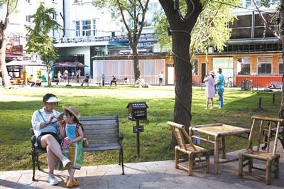 夏日的午后,“友谊花园”最核心的800平方米的草坪周边,不少市民和游客随意坐在商家的外摆区域,有的品尝着特色餐点正在与朋友聊天,有的则是端着一杯咖啡独自享受午后的惬意,有的则忙着摆出各种姿势,让同行的伙伴帮忙拍照……周边降温装置喷射出的细密水雾,让青草绿树更为鲜嫩,环境也更加清新。