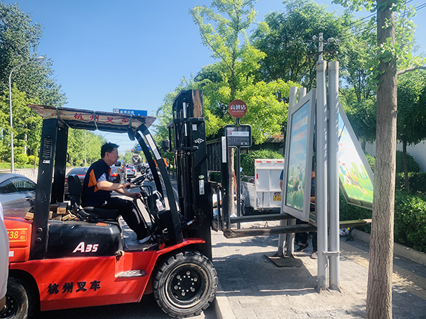 施工期间,为确保安全高效,社区工作人员现场引导行人绕行、协调车辆避让,维修工人则严格按照方案,使用专业作业叉车稳固橱窗,对松动底座进行加固并更换受损配件。经过数小时紧张作业,倾斜的橱窗被彻底矫正固定,安全隐患成功消除。