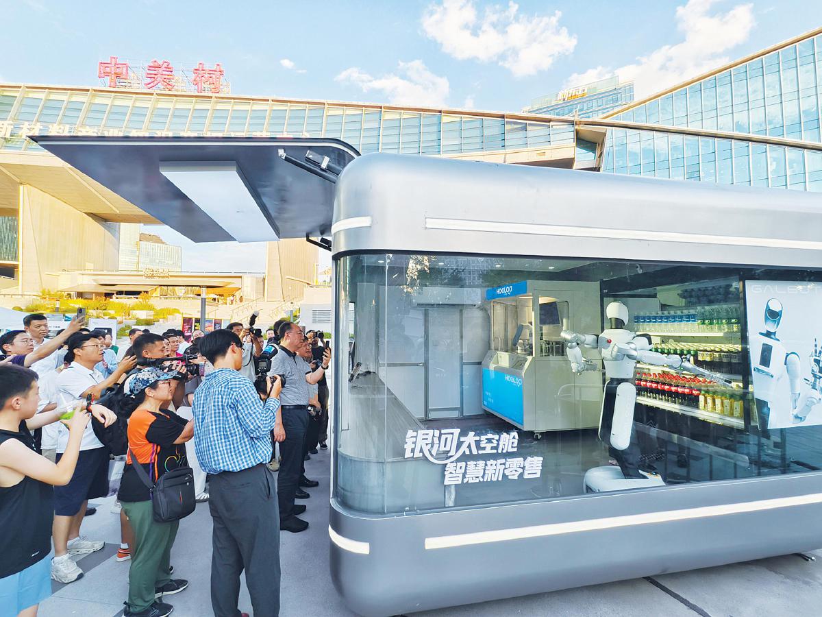 8月7日,北京市中关村大融城,新亮相的智慧零售店银河太空舱,零售店员Galbot机器人在为嘉宾取购买的饮料。当晚,北京中关村大融城,银河太空舱全球首发仪式暨“十城百店”合作伙伴计划启动仪式举行,这标志着,全球首个城市级、常态化运营的人形机器人示范区正式落地海淀。 新京报记者 浦峰 摄影报道