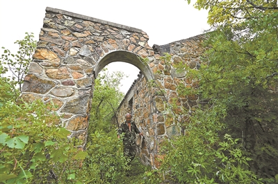 离开人字形营房,北青报记者沿山坡向东步入一块台地,这里的房屋更显颓败,残墙内外种满庄稼和果树。就当北青报记者以为兵营规模不过如此时,齐春福将记者引向南山的更高处。穿过一片栗树林,北青报记者来到半山腰,又见到依山而建的石头房子,同样是断壁残垣、不避风雨,在一堵高约两米的残墙前,齐春福停下脚步说:“这就是日本人留下的炮楼,过去应该是两层,根据残存的环形房基判断,炮楼为圆柱形。”
