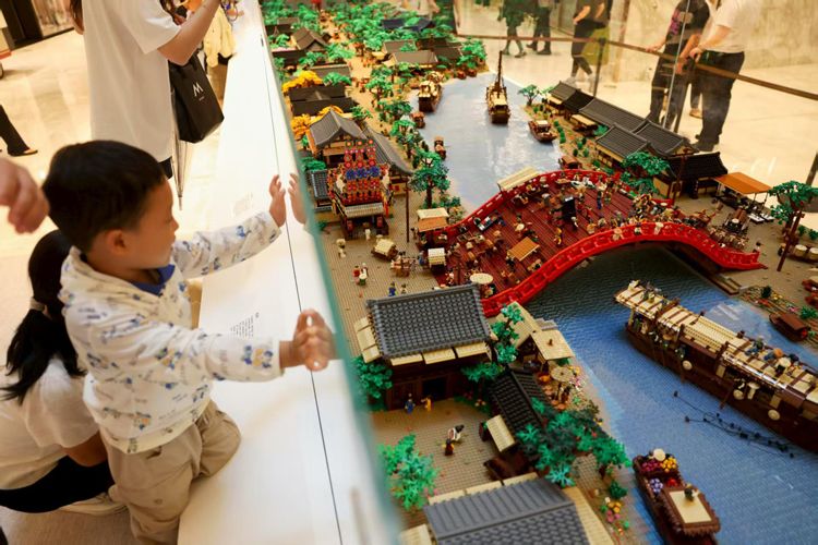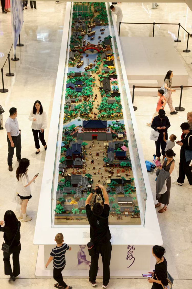 8月8日,“风流:东方文艺复兴大展”在北京国贸商城开幕,展览通过“大展·工坊·雅集”三大板块,融合传统非遗技艺与当代艺术创作,打造为期38天的沉浸式文化体验。图为香港乐高大师洪子健动用三百万颗乐高积木搭建的《清明上河图》。