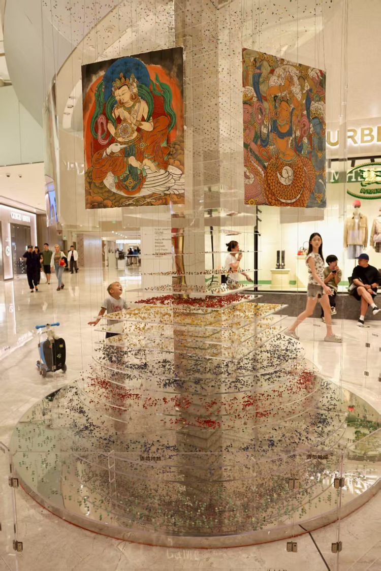 藏族唐卡艺术家泽朗登珠作品《八宝瑞相》。展览将水墨画、唐卡、古家具等传统文化元素转化为《御风而行》《天人合一》等六组大型装置艺术,展现东西方美学对话。通过北宋风情市集、鱼灯夜游等活动,再现汴京商贸盛景,让消费者在购物场景中感受传统文化生命力。展览将持续至9月14日。