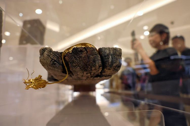 艺术家施斌作品《观自由》。作品由亚克力、百年船木和纯金花丝镶嵌手工艺品构成。