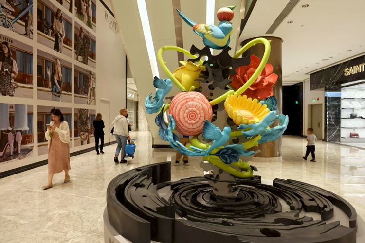 艺术家直林创作的雕塑《四时颂春》。作品以全新视角表现太湖石、花卉、珍禽等传统书画中的元素。