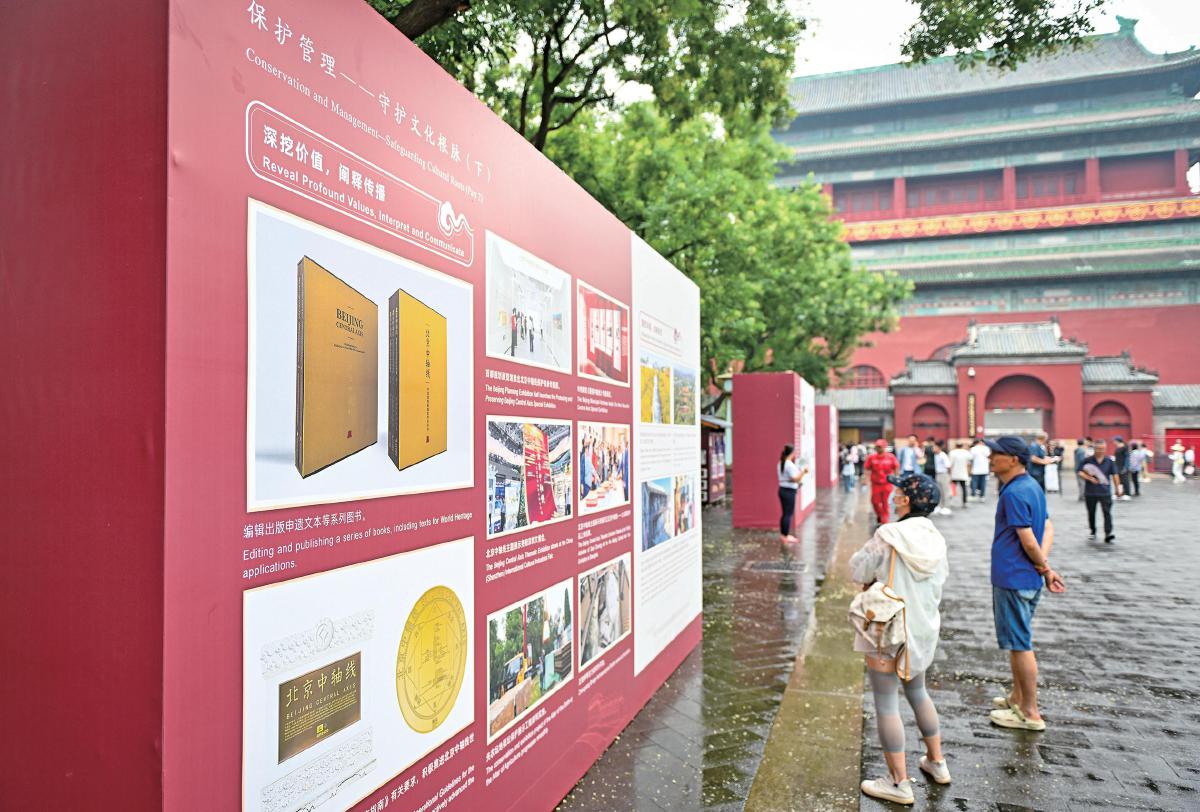 7月27日,人们在北京钟鼓楼广场上观看介绍北京中轴线申遗成功一周年成果的展板。新华社记者 陈钟昊 摄