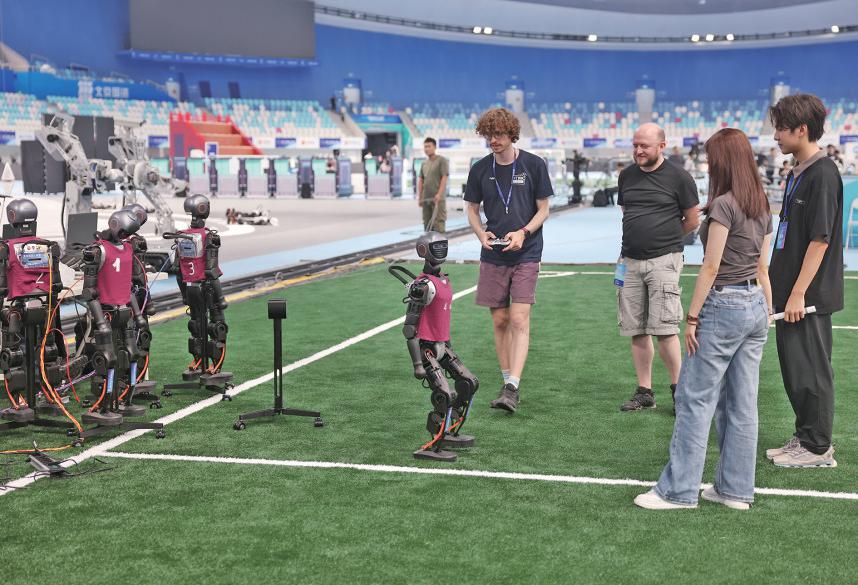外国参赛选手在调试足球机器人。