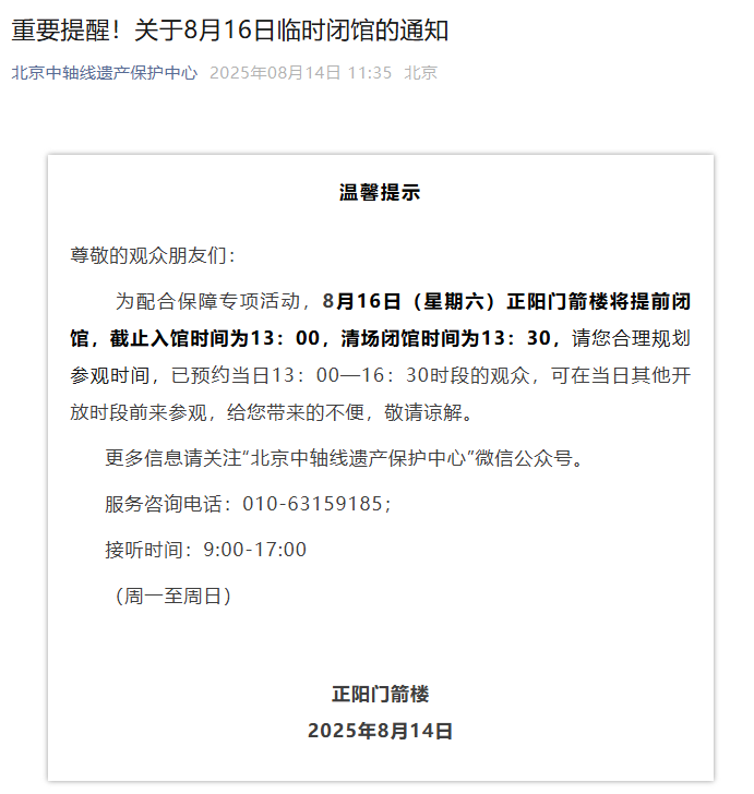 新京报讯 据北京中轴线遗产保护中心微信公众号消息,为配合保障专项活动,8月16日(星期六)正阳门箭楼将提前闭馆,截止入馆时间为13:00,清场闭馆时间为13:30,请您合理规划参观时间,已预约当日13:00—16:30时段的观众,可在当日其他开放时段前来参观,给您带来的不便,敬请谅解。