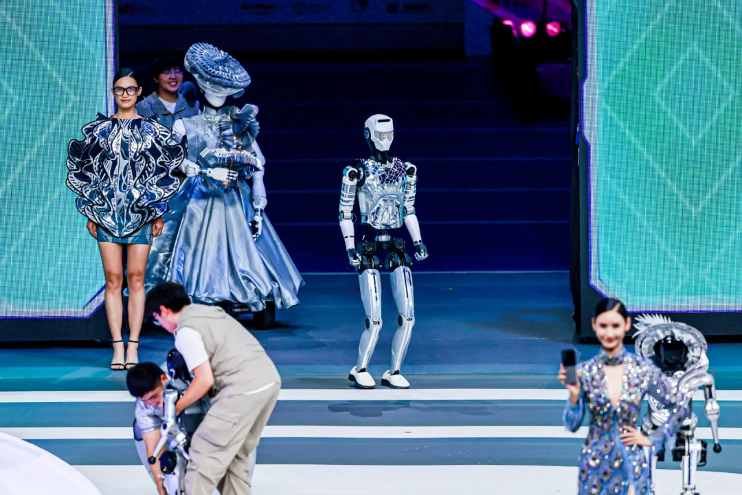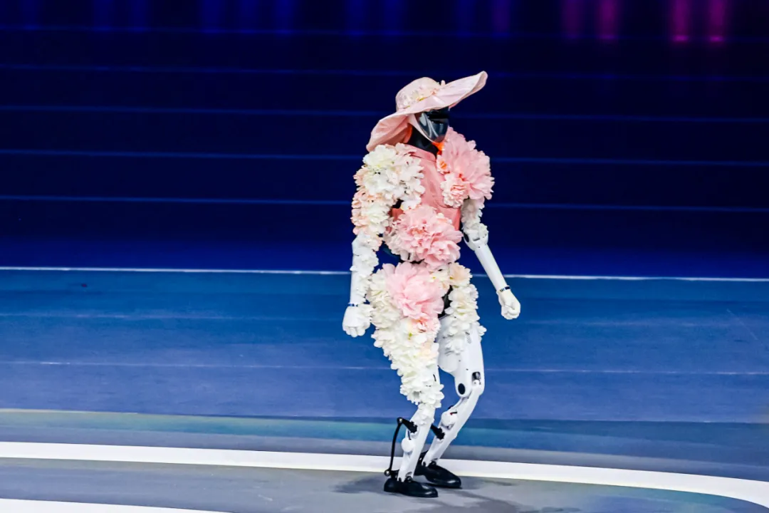 服饰走秀节目《天工霓裳》则将非遗技艺与未来设计完美融合。天工机器人身披牡丹芍药纹样服饰,松延动力机器人演绎土楼文化意象,鳞片机器人铠甲融合羽翼纹样与现代美学,乐聚机器人所穿服装灵感来自于敦煌莫高窟……3D打印与手工工艺结合的定制服装,让机器人模特成为移动的“文化科技融合展”,展现具身智能在时尚领域的应用潜力。