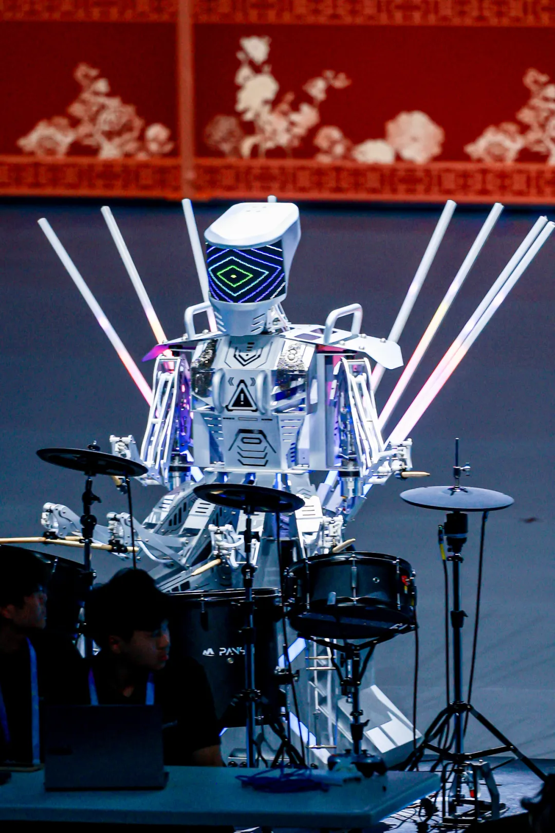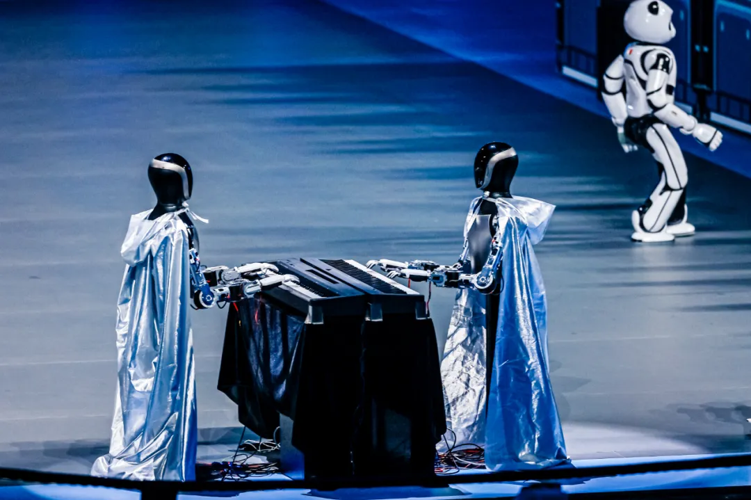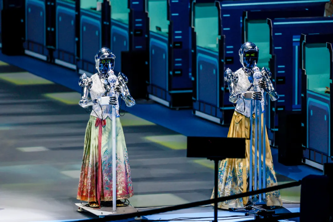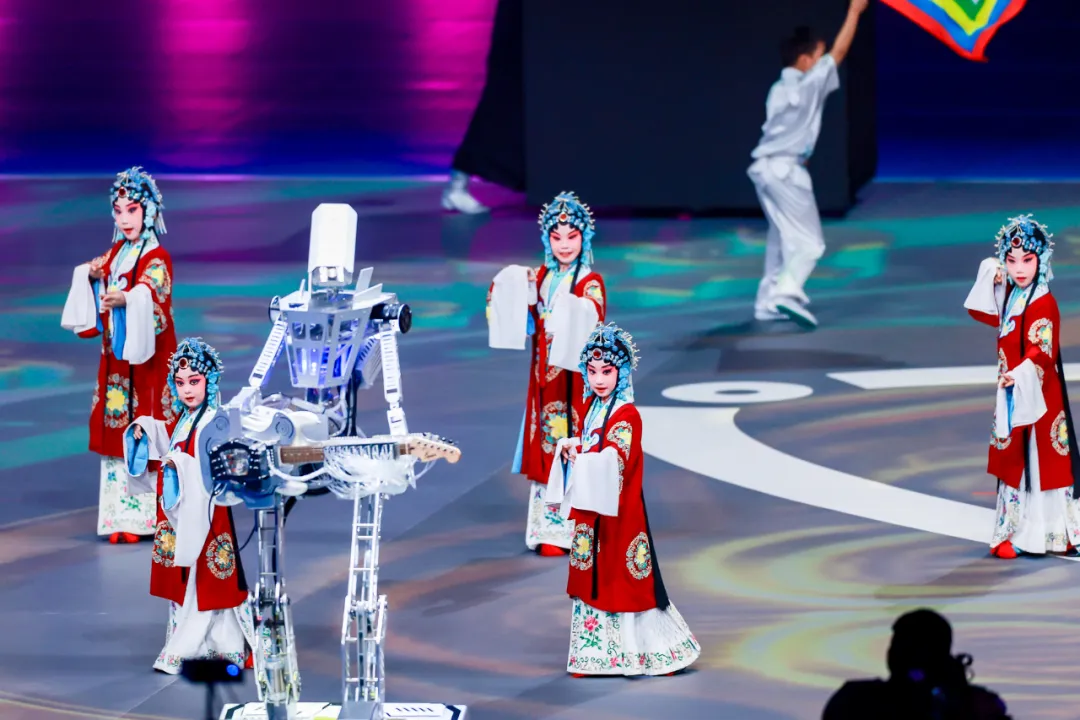 传统文化创演《智韵和鸣》更成为亮点——磐石机器人乐队与灵心巧手机器人奏响国风旋律,乐聚机器人表演太极,优必选熊猫机器人与武术少年共展拳脚,“穆桂英”造型的戏曲机器人与小演员同台唱响《穆桂英挂帅》,尽显千年文脉与现代科技的“琴瑟和鸣”。