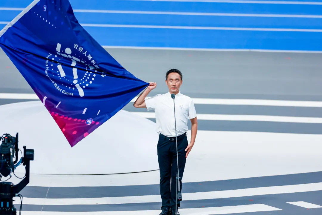 全场集结亮相和奏国歌之后,在赛前宣誓环节中,清华大学张继东作为裁判员代表宣誓,天工2.0 pro机器人代表运动员宣誓,传递公平竞技的体育精神。随着“能量传递VCR”播放,舞台中央的“智芯”装置——镶嵌蓝色晶体芯片的金属四棱锥被点亮,象征科技与人文的共生,也宣告赛事正式启动。