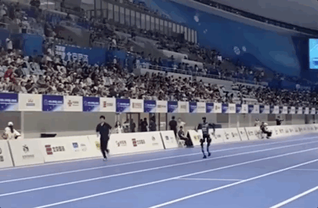 1500米田径赛比赛过程中,有的机器人大步快跑,旁边的操作员差点赶不上;有的机器人悠闲地迈着小碎步;还有的机器人拐着弯前进。