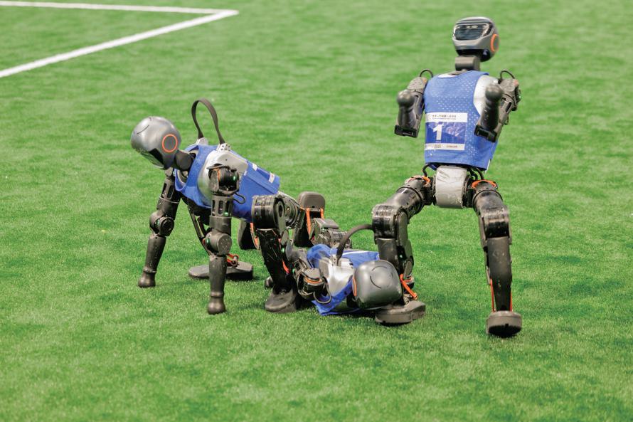 8月17日,足球5v5半决赛,机器人摔倒后独立起身。新京报记者 王子诚 摄