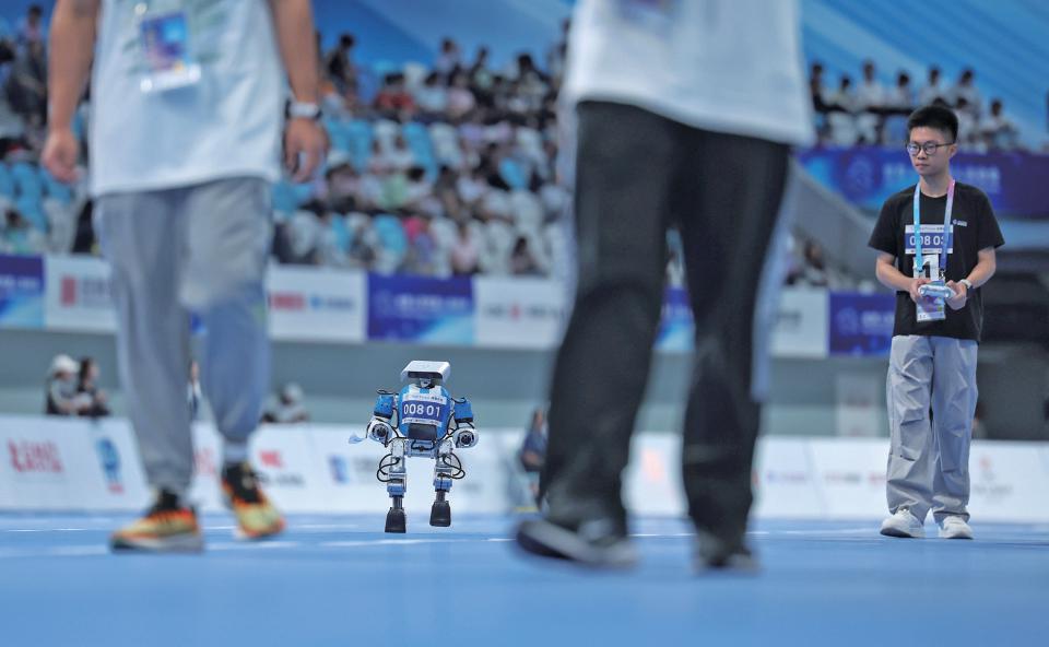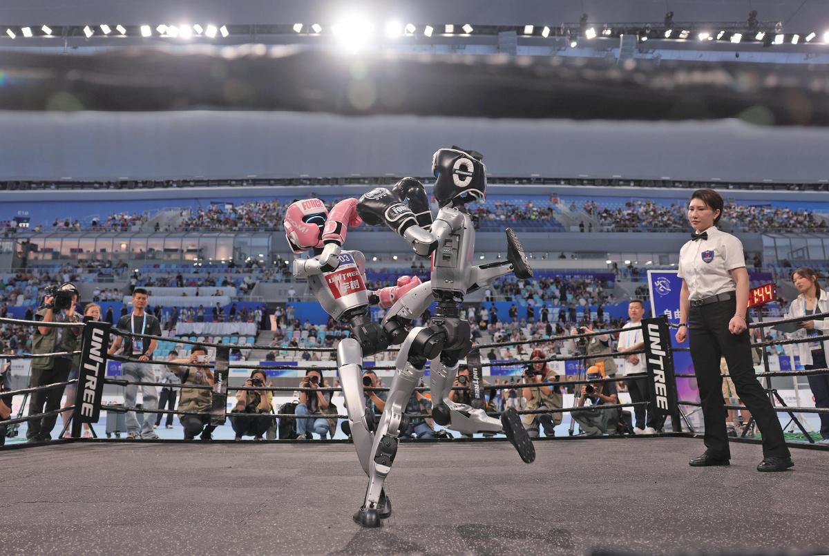 自由搏击项目中,机器人在保持脚下动作灵活的同时,还能进行高难度腿部攻击,机灵劲儿十足;田径赛场上,机器人“大长腿”更是优势明显,展现出不俗的实力;参加舞蹈比赛比拼“舞艺”的机器人运动员们,能随着音乐灵活律动,还能做出高难度的街舞动作……