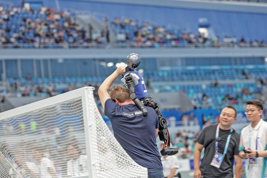 8月17日,足球5v5决赛,参赛机器人团队工作人员搬运摔倒机器人离场。 新京报记者 王子诚 摄
