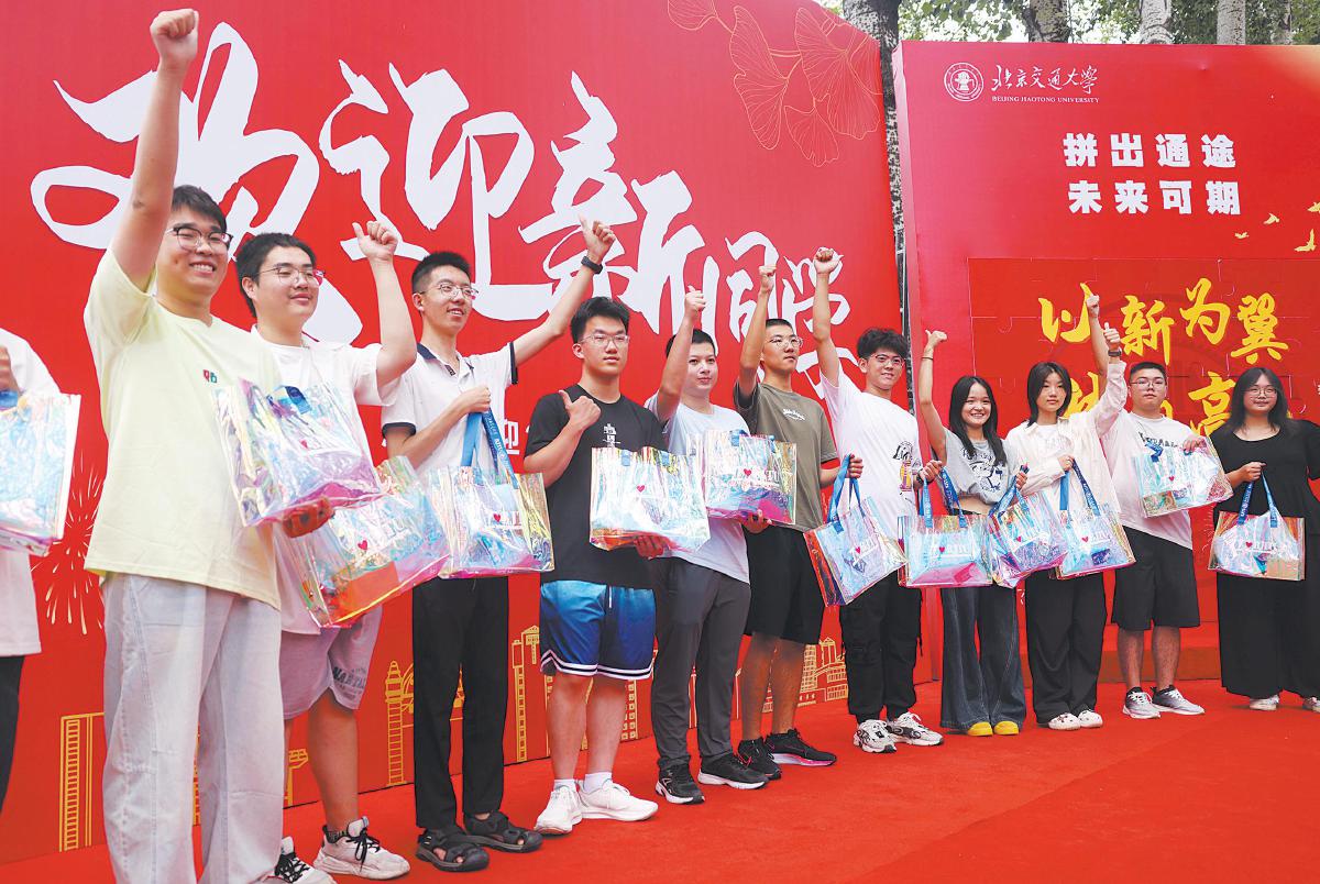 8月24日,北京交通大学,当天过生日的新生“小寿星”们收到了校领导赠送的生日礼物——校园文化衫、文创马克杯。当日,北京交通大学开启2025年本科生迎新工作。据介绍,北京交通大学2025级本科各类学生总人数合计4323人,其中,北京本部校区的新生为3644人,威海校区679人。