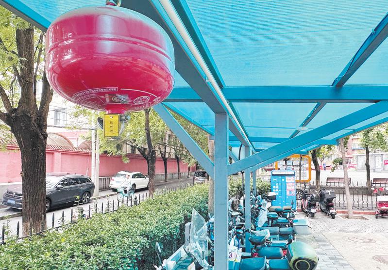 丰台区西罗园街道第四社区,电动自行车充电车棚内配备了可自动感应的消防设施。