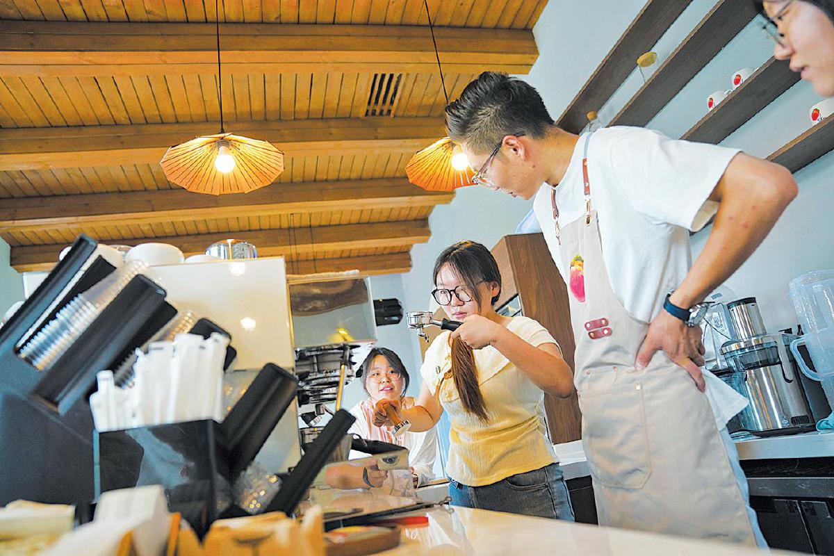 7月27日,平谷区峪口镇蔡坨村农场咖啡,北京农学院的学生在学习制作咖啡。