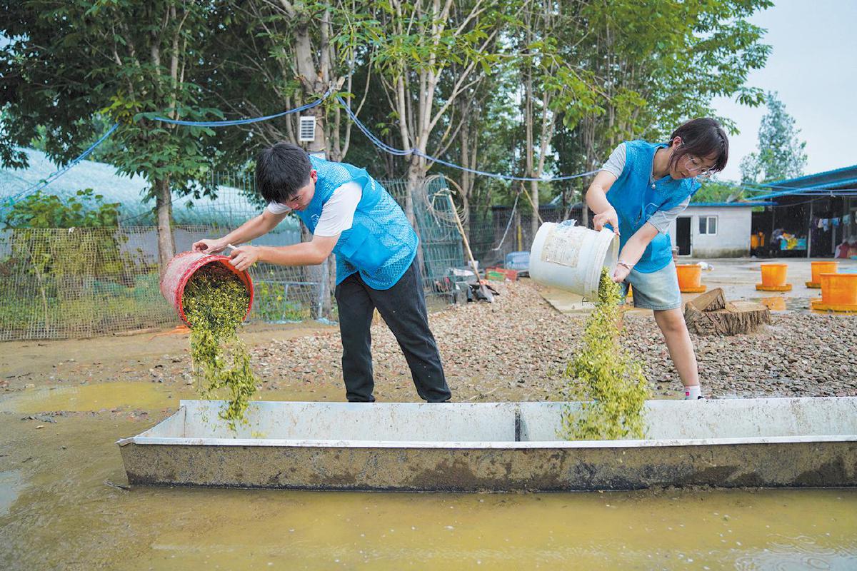 7月27日,平谷区马坊镇,北京交通大学的学生们在大鹅养殖场内准备饲料。