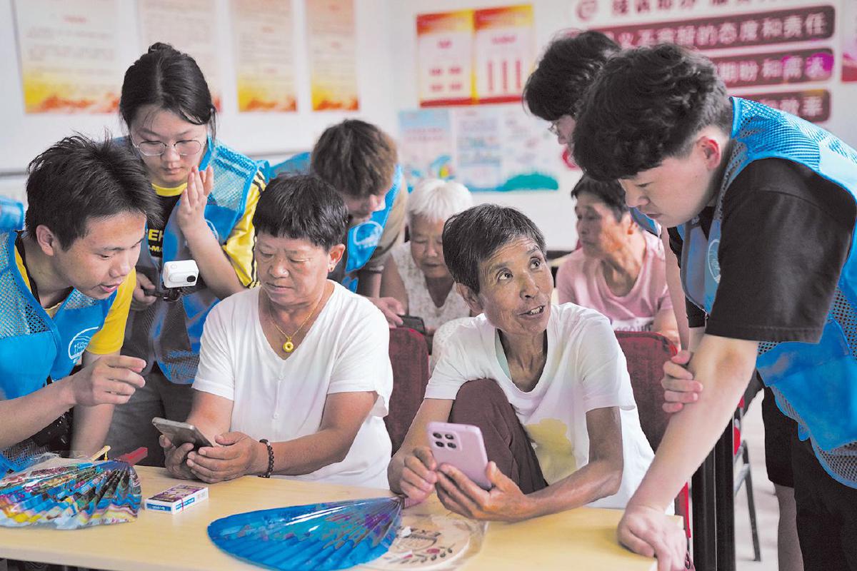 7月27日,平谷区马坊镇,北京交通大学的学生们在教村里的老人们使用智能手机。