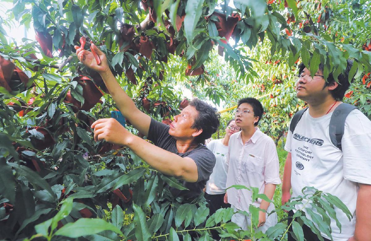 7月25日,平谷区峪口镇兴隆庄村,中国农业大学的学生们在跟着桃农学剪枝。