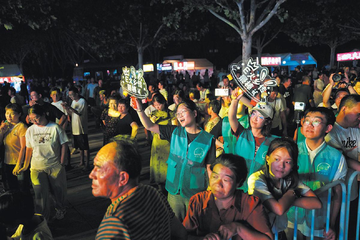 7月26日,平谷区马坊镇音乐市集,北京交通大学的学生们举着“E火乡传”的灯牌为演唱的同学加油。
