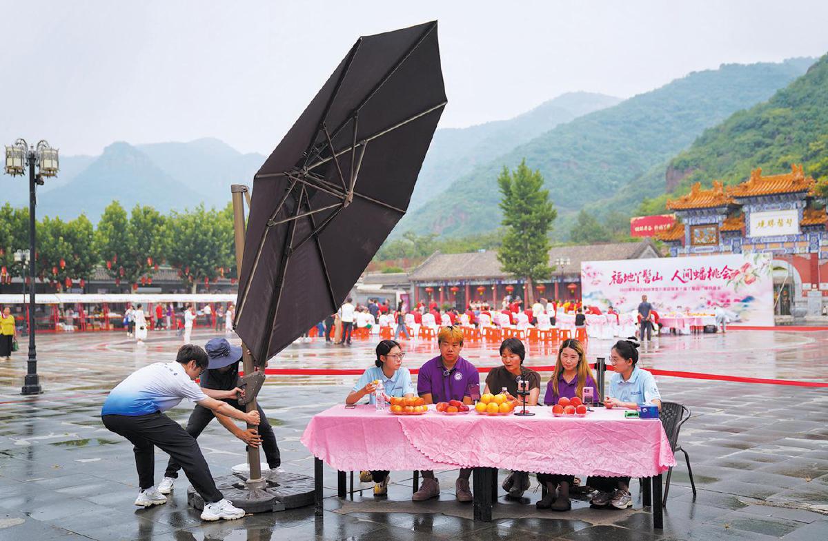 7月27日,平谷区丫髻山,大学生们和全国人大代表、乡村电商达人岳巧云(中)一起直播卖桃。