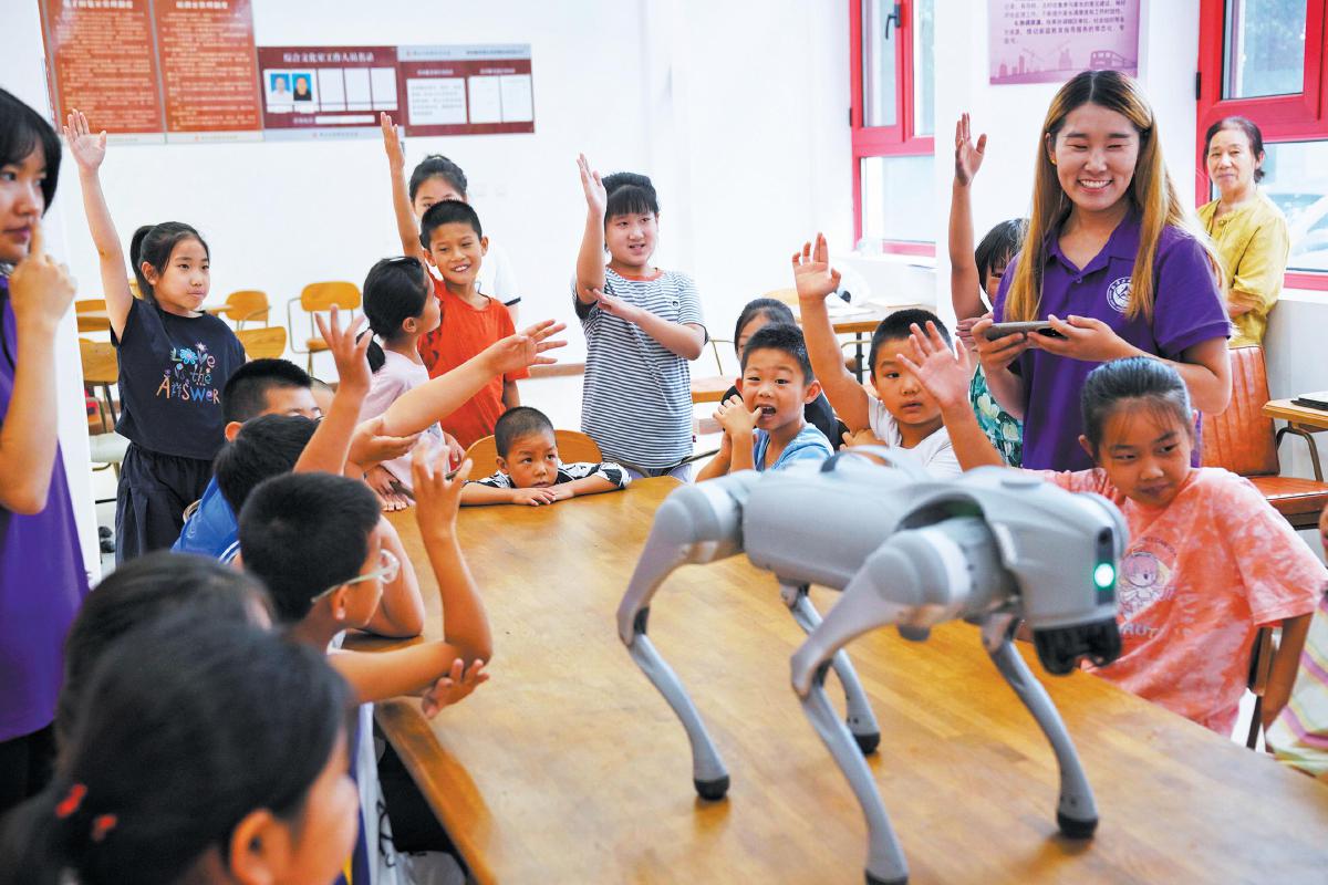 7月27日,平谷区刘家店镇前吉山村,北方工业大学的学生们带着孩子们上机器人体验课,孩子们看到机器狗兴奋不已。北方工业大学社会实践团开设“公益半日课堂”,每天开设两节课。