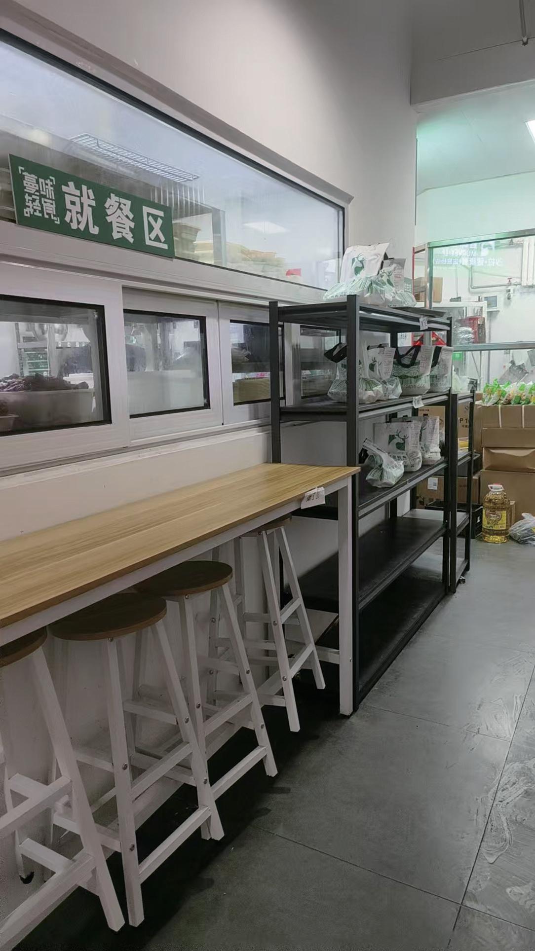 首先看到的是该店铺的“厨房”,通过店家张贴的标志,“蔓味轻食店内就餐请往左走”,就可以看到就餐区。就餐区就在厨房窗户外面,放置了一条窄桌子,有四把椅子,就餐区对面也堆满饮料、方便面等杂物。