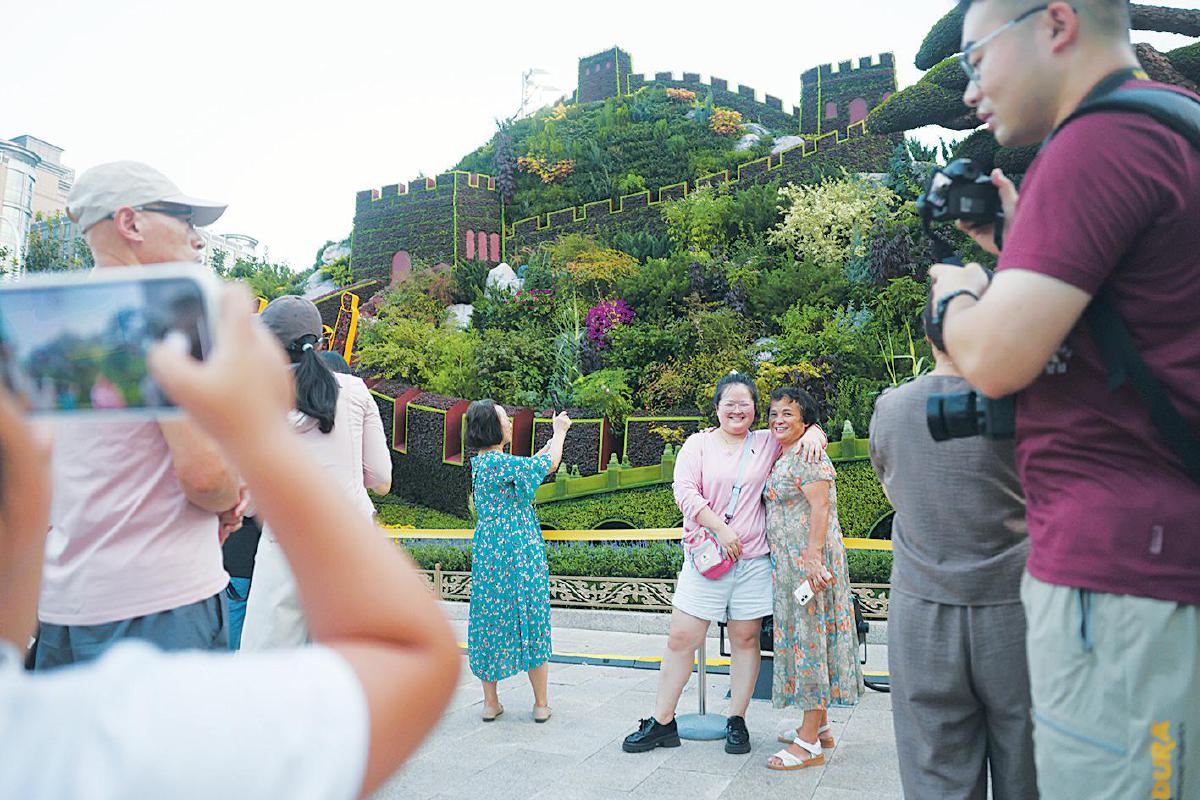 8月31日,市民、游客在“众志成城”花坛前拍照留念。 新京报记者 李木易 摄