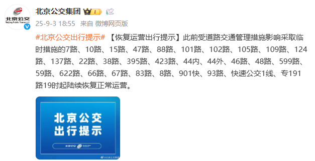 9月3日,北京公交集团官方微博发布恢复运营出行提示:此前受道路交通管理措施影响采取临时措施的7路、10路、15路、47路、88路、101路、102路、105路、109路、124路、137路、22路、38路、395路、423路、44内、44外、46路、48路、599路、59路、622路、66路、67路、83路、8路、901快、93路、快速公交1线、专191路19时起陆续恢复正常运营。