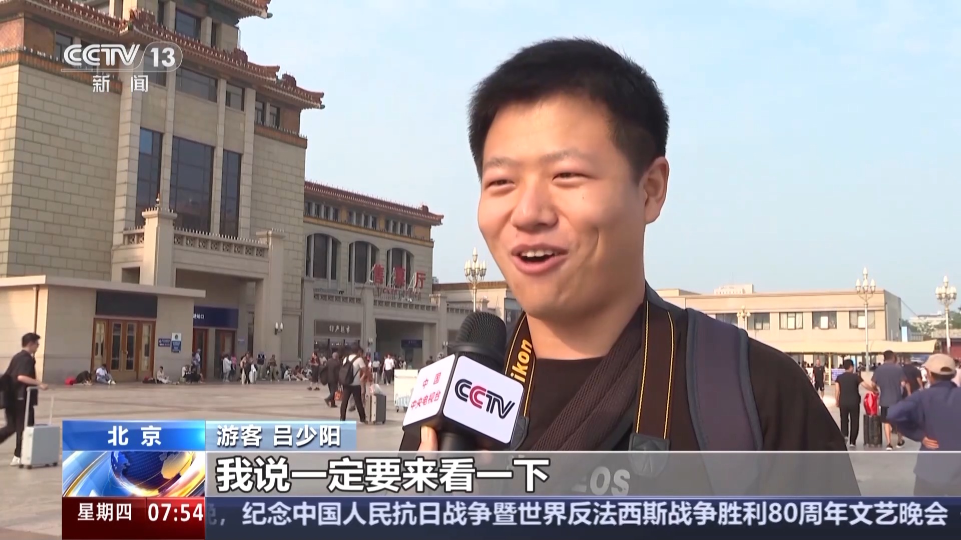 北京市三里屯街道居民 白少飞:刚刚通过大屏看了直播,心情到现在还没平静;此时此刻,感觉到80年前我们的先烈先辈们抗战取得的胜利,给我们带来了今天这样的和平,我感到很自豪。