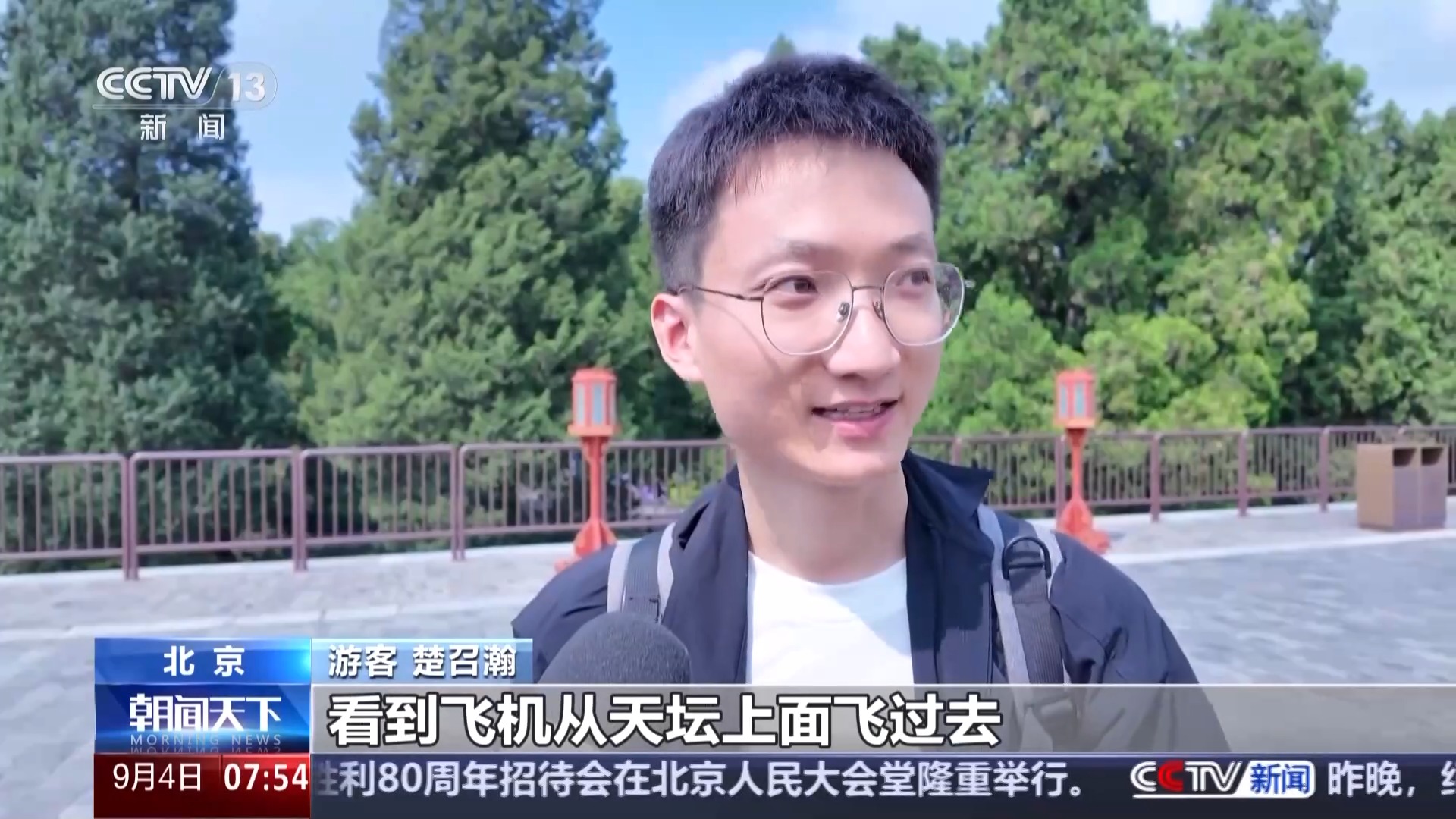 游客 楚召瀚:第一次能够有机会在现场看到飞机从天坛上面飞过去,当悬挂着党旗和国旗的飞机从祈年殿的上空划过的那一刻,内心非常自豪,也非常激动。