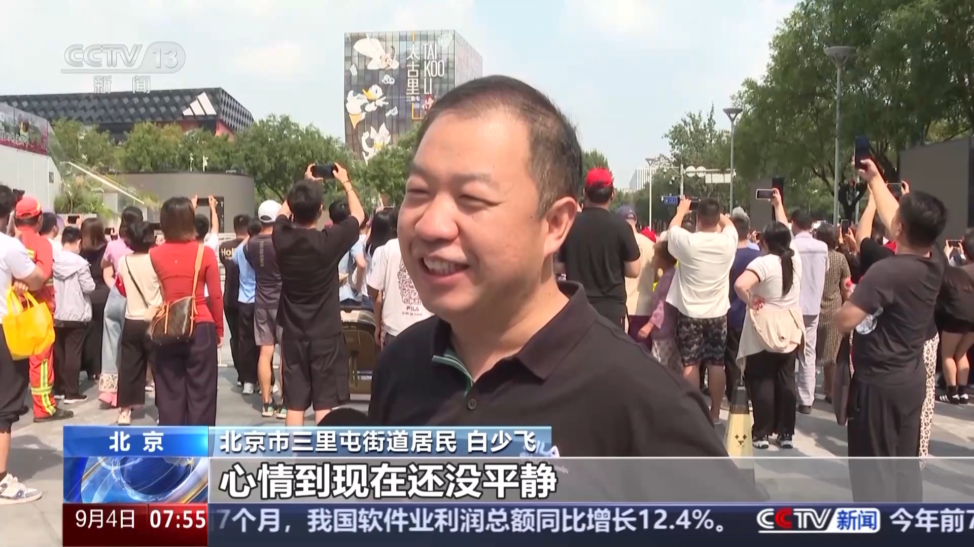 早上9:00,不少市民来到北京天坛、三里屯等多个地标位置,近距离感受阅兵的震撼。