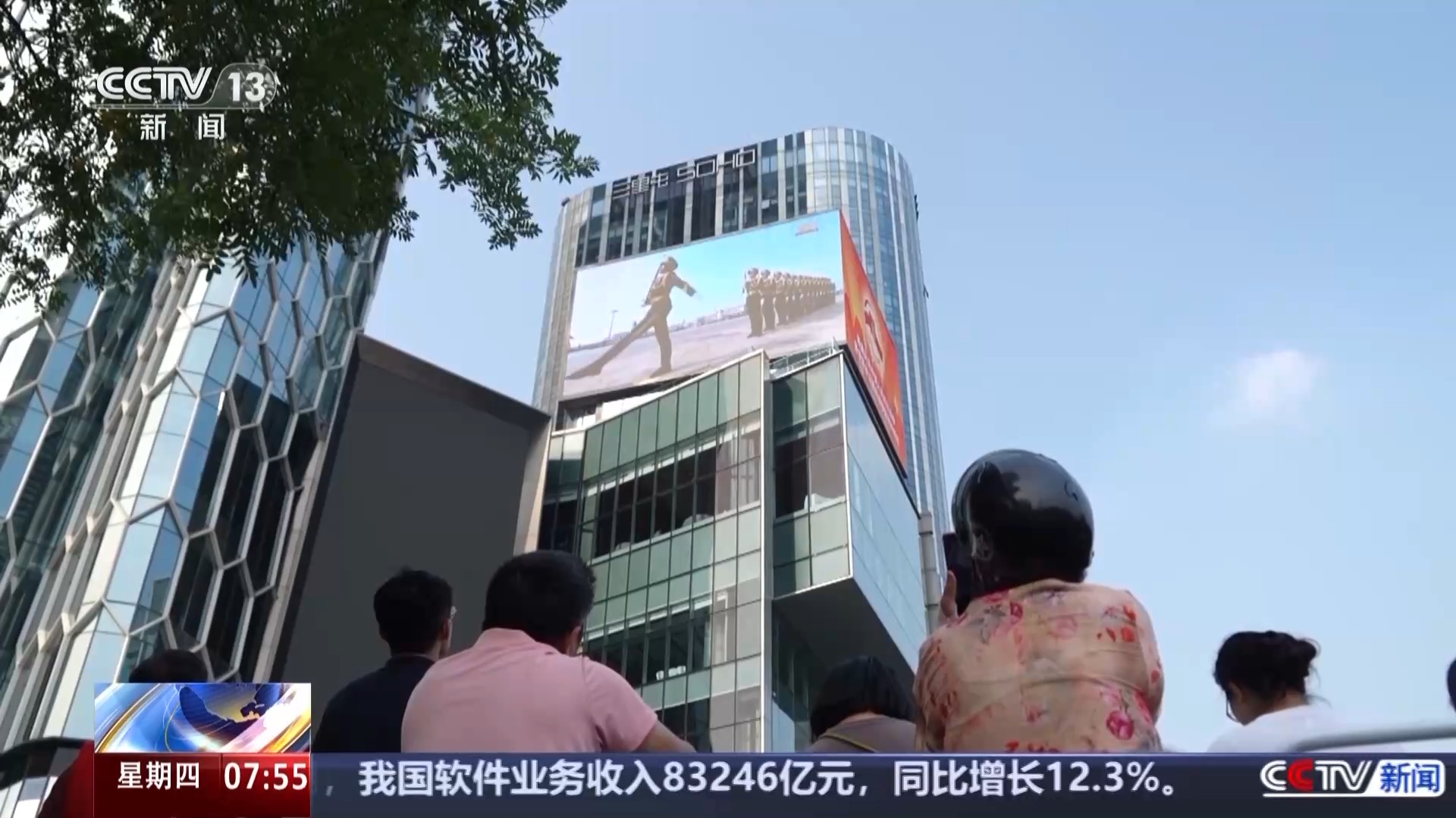 在三里屯街区的户外大屏,很多市民不约而同聚集在一起观看纪念活动电视直播。特别是在已参加阅兵的装甲车返回经过街道时,现场气氛一下子就沸腾了。