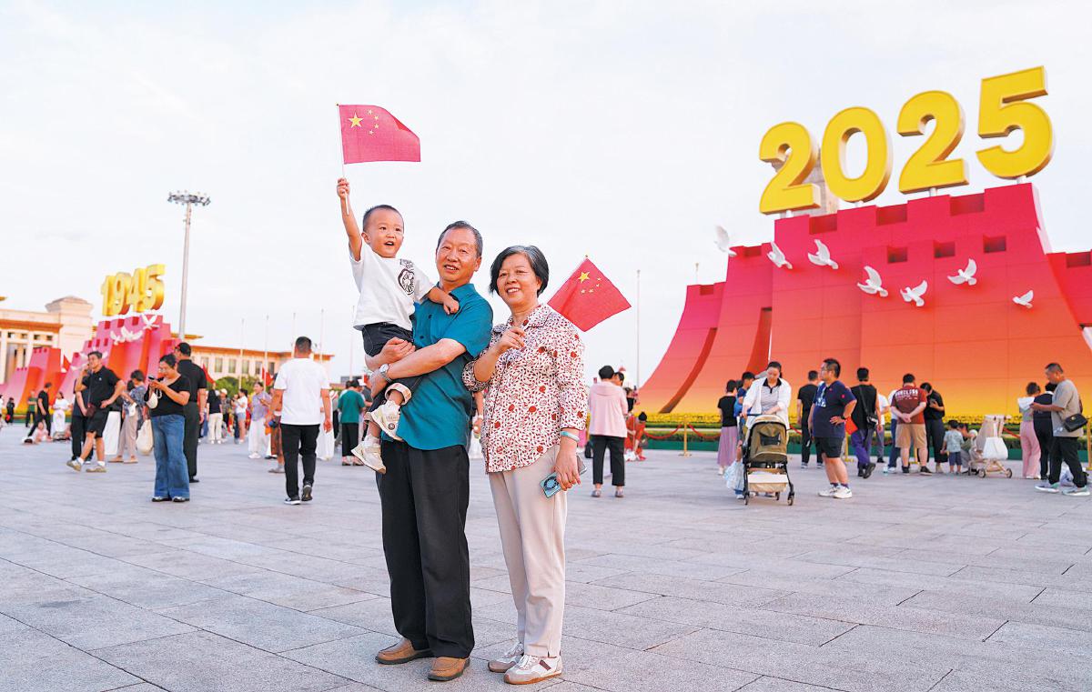 9月7日,天安门广场,游客举着国旗在年号台前留影。纪念中国人民抗日战争暨世界反法西斯战争胜利80周年大会9月3日在北京天安门广场隆重举行。纪念大会结束后的首个周末,不少市民、游客专程来到天安门广场,感受纪念抗战胜利的热烈氛围。 新京报记者 薛珺 摄影报道