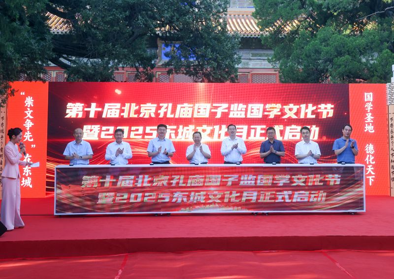 9月8日,孔庙和国子监博物馆大成殿前,礼乐悠扬,古韵流芳。由北京市文物局、中共东城区委、东城区人民政府主办,中共东城区委宣传部、东城区文化和旅游局、孔庙和国子监博物馆、安定门街道承办的第十届北京孔庙国子监国学文化节开幕式暨2025东城文化月启动仪式,在这里盛大举办。图为与会领导嘉宾共同登台启动“第十届北京孔庙国子监国学文化节暨2025东城文化月”。