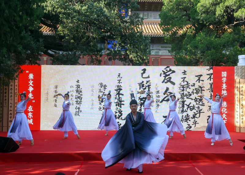 2025东城文化月将推出5大主题板块50余项特色活动,串联辖区永定门、隆福寺、钟鼓楼等文化地标推出4条文化探访线路,同步开展文化惠民消费活动,联合70余家文化机构推出涵盖“观影、看戏、赏展、购书、体验”五大类的百万文化惠民补贴,持续释放文化消费潜力,持续提升区域品质和文化吸引力。第十届北京孔庙国子监国学文化节于2025东城文化月期间举办,活动以“国学圣地,德化天下”为主题,开展“万世师表,国学大典”“大学之道,守正创新”“春风化雨,国学讲堂”“文润东城,国学联动”四大板块活动。图为舞蹈表演《书简舞·孔子》。