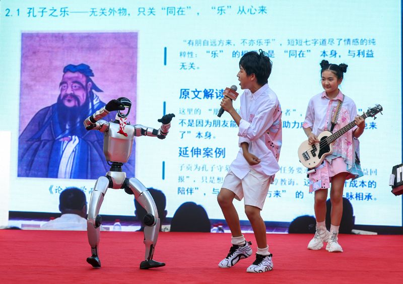 小鹤鹤艺术团的同学们与在2025世界机器人大会上精彩亮相的宇树机器人东东,共同带来歌舞表演《中国少年》。