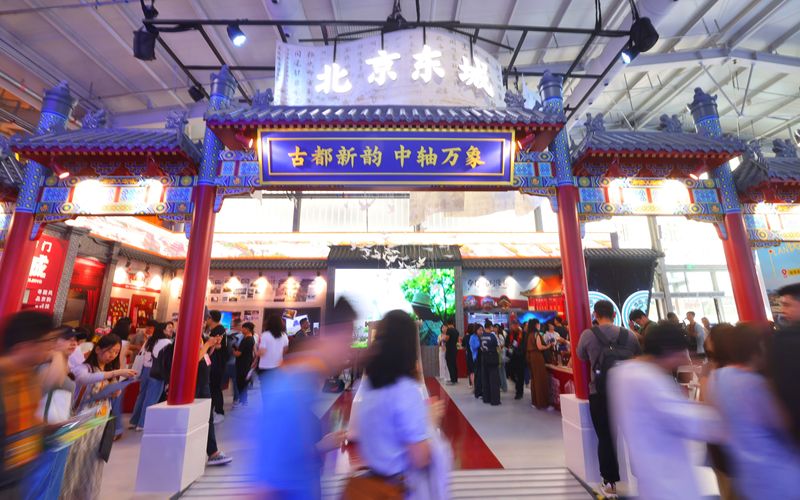 9月10日至14日,2025年中国国际服务贸易交易会(简称“服贸会”)在北京首钢园区举办。位于首钢文创园9号馆的文旅服务专题展人气火爆,这里不仅有丰富的文创产品,还有精彩的现场表演。东城区以北京中轴线为设计主线,串联起前门、隆福寺、王府井三大商圈场景,将一个微缩版的“东城一日游”搬进展区,吸引众多观众前来逛展、打卡。