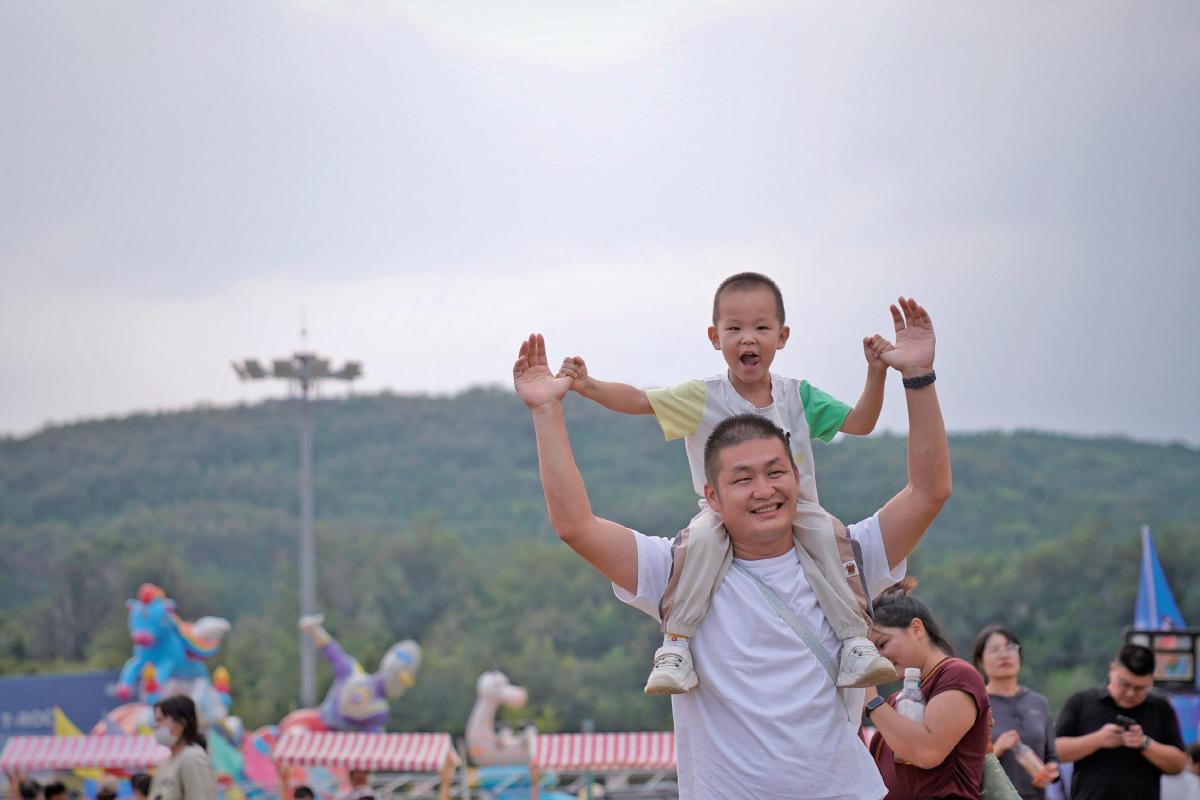 场景:小男孩坐在爸爸肩头开心大笑。 新京报记者 薛珺 摄