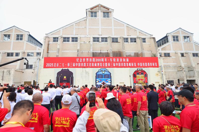 在世界铁路建成开通运营200周年到来之际,9月27日10时20分许,在中国工人运动的发祥地(原北京长辛店二七机车厂),90岁高龄“毛泽东号”第七任司机长陈福汉和现任“毛泽东号”副司机长宣杰,共同拉响“龙号机车”发车汽笛,第三届中国铁路文化收藏博览会暨中国铁路集邮展、摄影展在京开幕。