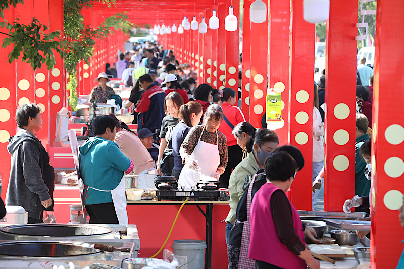 “慢”与“醉”的体验藏在每个细节里。游客可沿着月亮桥穿行稻海,在观景台定格哪吒稻田画与市集烟火同框的画面;特色手作区里,村民手把手传授钩针编织、香囊制作技艺,让丰收记忆可触可感;田间茶座提供咖啡茶点,搭配现做的炸糕、豆腐脑,构成最地道的秋日滋味。不同于传统市集的匆忙,这里特意设置“宝山味道”产品展台,种植户现场讲述五彩旱稻等农产品的培育历程,让每份食材都承载风土人情。