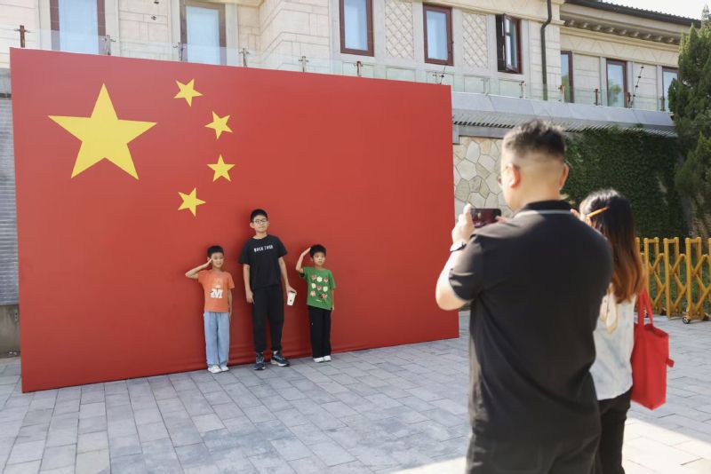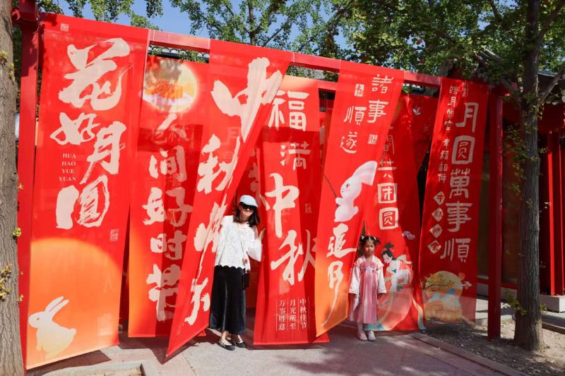10月2日,海淀区同庆街,游客在双节景观中留影。国庆假期,海淀文旅集团在同庆街、颐和园、圆明园、香山(静宜园),以“一街三园”联动,融合中医养生、非遗文创、皇家园林、自然景观、深度研学等多元业态,为广大市民和游客带来沉浸式、差异化的国庆假日文化体验。